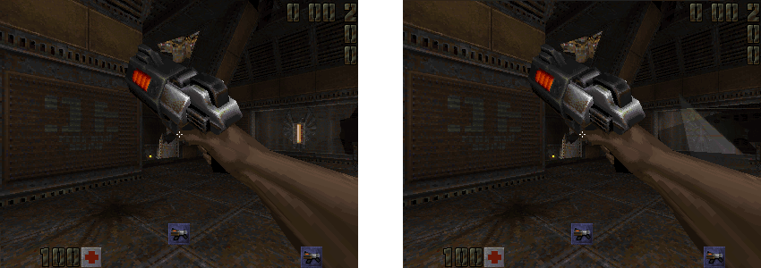 That difference is the result of a 64-bit specific memory corruption bug, caused by misuse of "sizeof". Left hand side is correct (x86). Right hand side shows the bug (AMD64). The fix is here. Quake 2 managed to render a single frame before crashing spectacularly, and I was pleased to find that the effect that had caused the crash is actually visible in the transparent texture on the right-hand side of the frame.